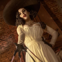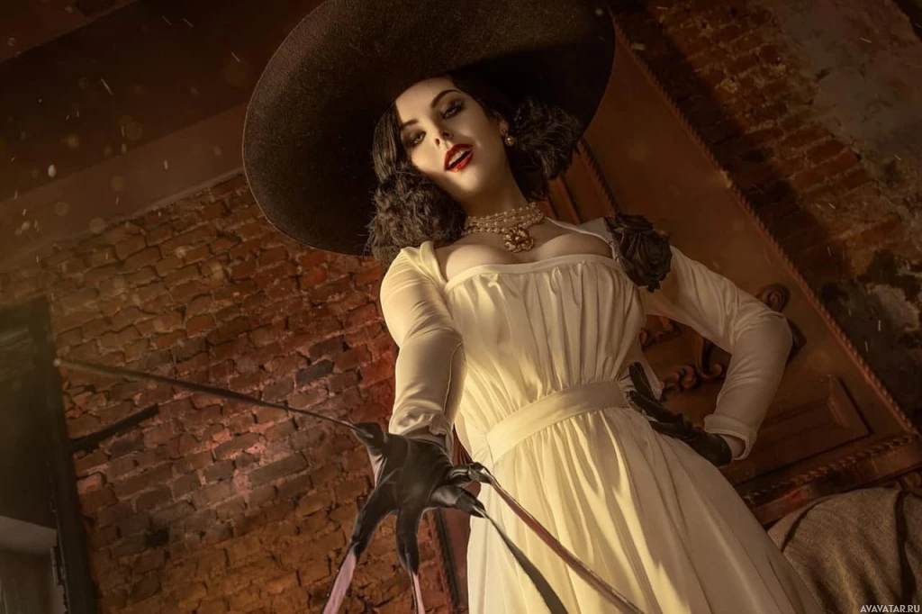 the video game "Resident Evil Village." She is portrayed in a cosplay-like costume, which includes a large