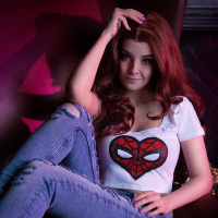 book series. They are wearing a top with an emblem resembling Spider-Man's iconic logo, suggesting that they are dressed in cosplay, which is a hobby where enthusiasts dress up as characters from movies, TV shows,