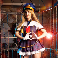 steampunk aesthetic, with decorative elements such as chains and gears, which suggest a mechanical theme. Behind her is an ornate structure that resembles a birdcage or enclosure, contributing to the overall