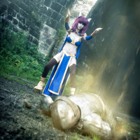 bridge structure in the background, with vegetation around it. There seems to be some kind of magic or energy emanating from the hand of the cosplayer, possibly indicating a scene where