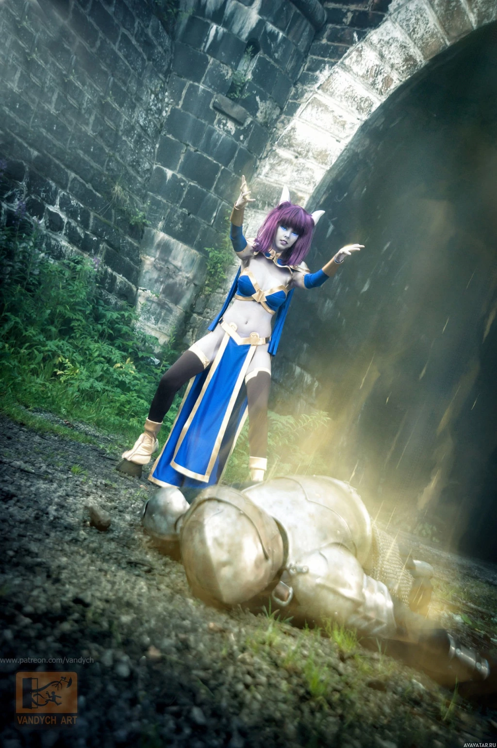 The image features a person in cosplay as a draenei from the game "