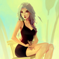 a sleeveless top with a high neckline. They appear to be resting their hand or arm on their lap. The background suggests