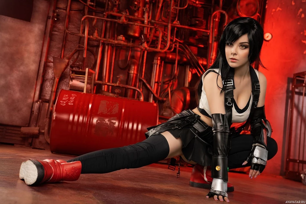 dark hair, wearing a black and red outfit that appears to be inspired by action-adventure games, featuring elements such as armor pieces and a utility belt. She has her hands resting on her knees in