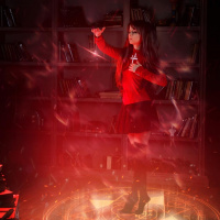a young woman standing in the center of what appears to be a magical or mystical scene. She is dressed in a costume that resembles a character from a fantasy series, possibly inspired by