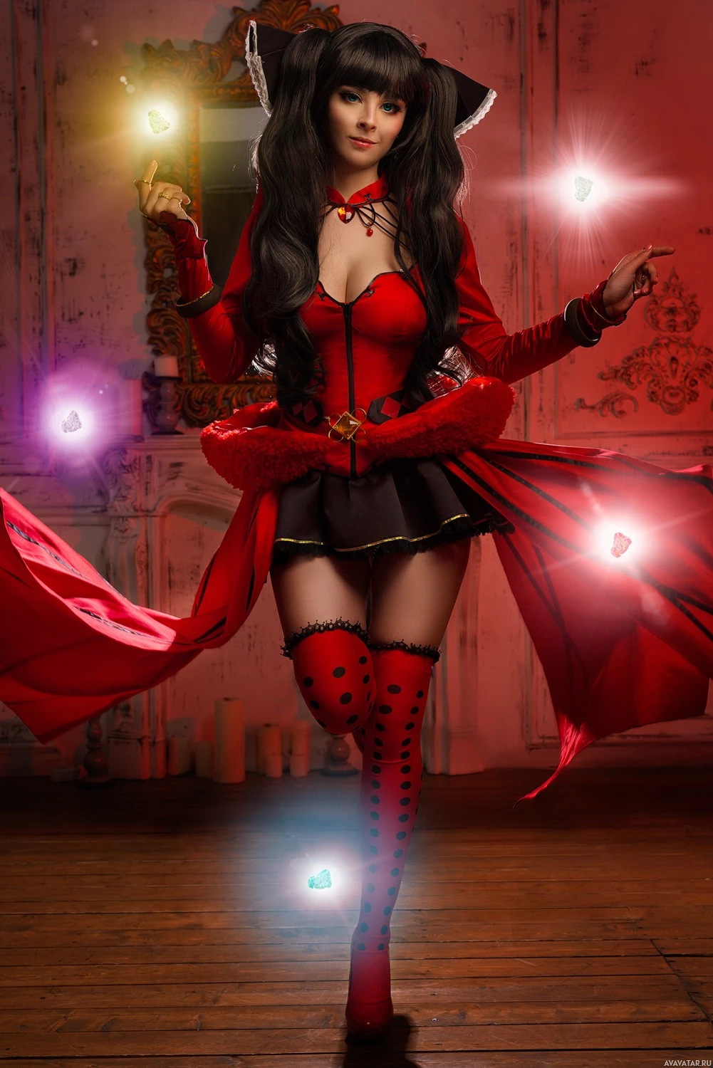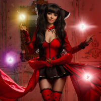 a gothic feel with dark wood paneling. The overall style of the image suggests it could be related to cosplay or fantasy-themed entertainment.
