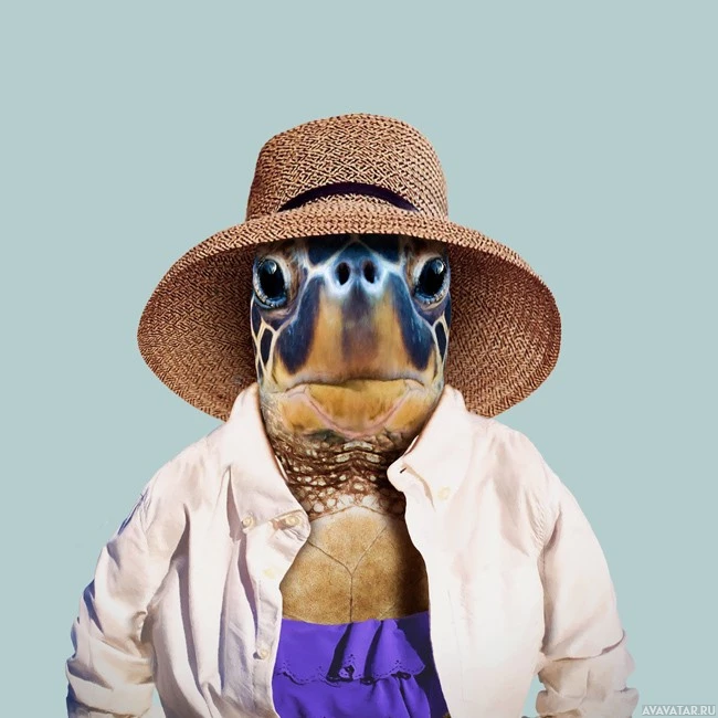 The image features a turtle wearing human-like clothes and accessories. It is dressed in a shirt, hat, and sunglasses, giving it an anthropomorphic appearance as if it were a person. There's also