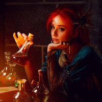 Triss Merigold, including a cape and other fantasy attire. The background suggests an alchemist's