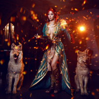 video game. The individual is surrounded by two wolves, and there are flames and sparks visible around them, suggesting a magical or fantastical setting.