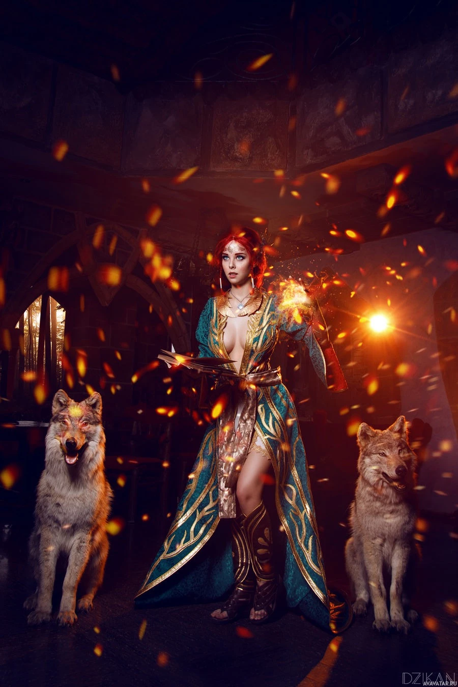 The image depicts a person dressed in cosplay attire reminiscent of the character Triss Merigold from "The Witcher 3: Wild Hunt"