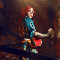 Triss Merigold from "The Witcher" game series. The individual is standing on what appears to be a stone staircase with a railing that has