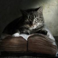 На картинке изображен кот, сидящий на открытой книге. Кошка смотрит прямо в камеру с несколько настороженным или любопытным выражением лица. Сеттинг тускло освещен, придавая ему уютную и несколько загадочную атмосферу.