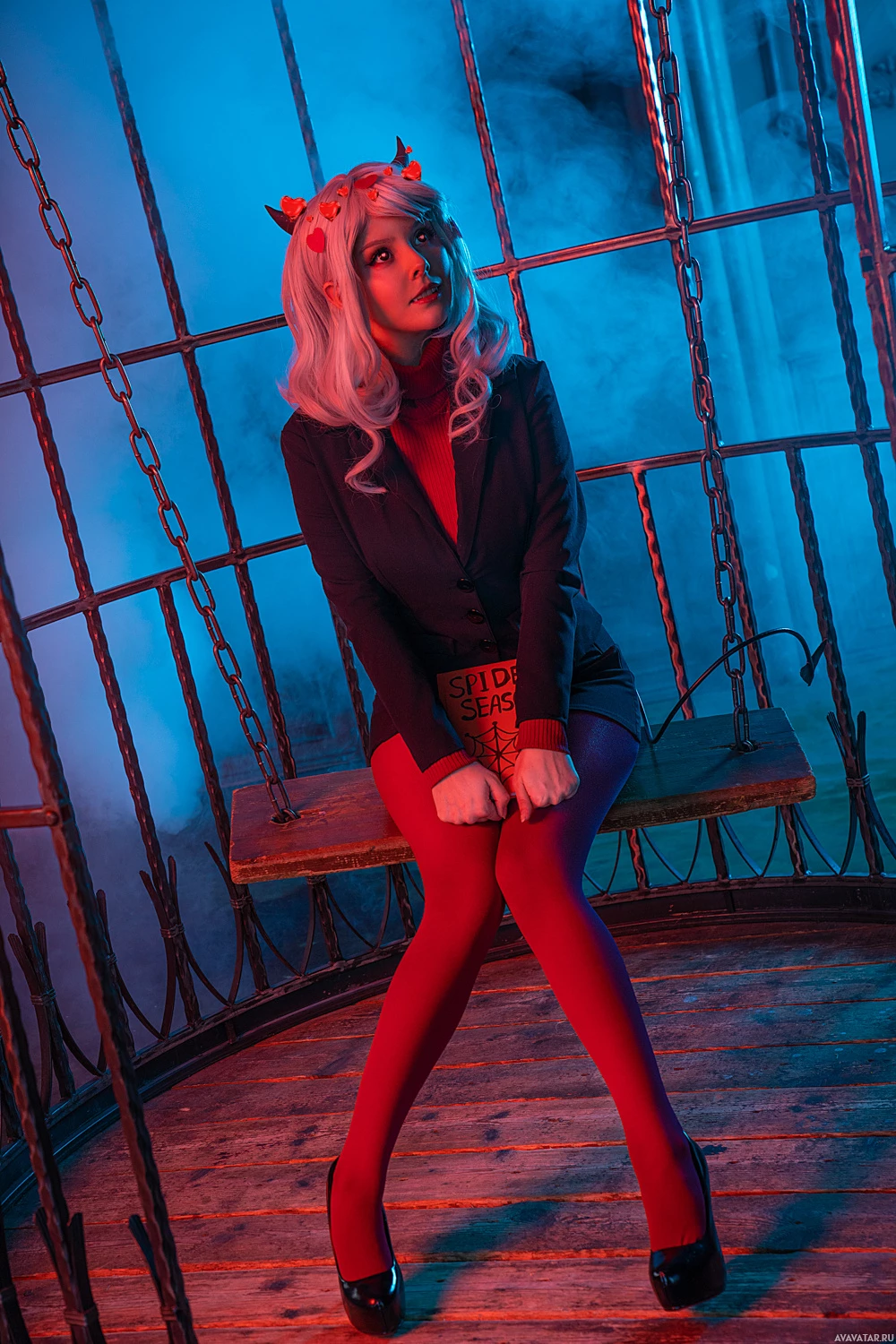 red hair, a red top with a high collar, black pants, and knee-high boots. The individual is sitting on what appears to be a metal bench or grate, surrounded by a dark, misty environment that suggests