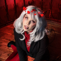 white hair and red contact lenses, giving them an unusual appearance. The individual is wearing what appears to be