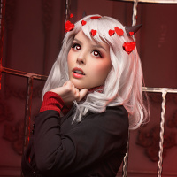 white hair and red devil horns on her head, wearing red tights. She has a demonic or "devil" appearance, which is often associated with the character she's portraying in cosplay. Her outfit appears to be inspired by