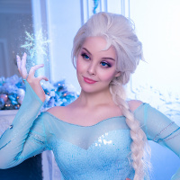 The image shows a person dressed in costume as Elsa from the Disney animated film "Frozen." They are wearing blue and white armor that resembles Elsa's outfit, with her iconic