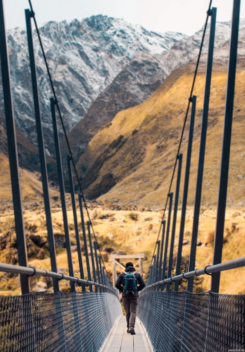 The picture shows a person walking on a bridge, seemingly in a mountainous or