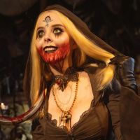 blonde hair and makeup that gives them a pale and ghostly appearance with darkened eyes and blood on their face, suggesting they are portraying a zombie or undead-like creature. They are wearing a costume that resembles a medieval or fantasy