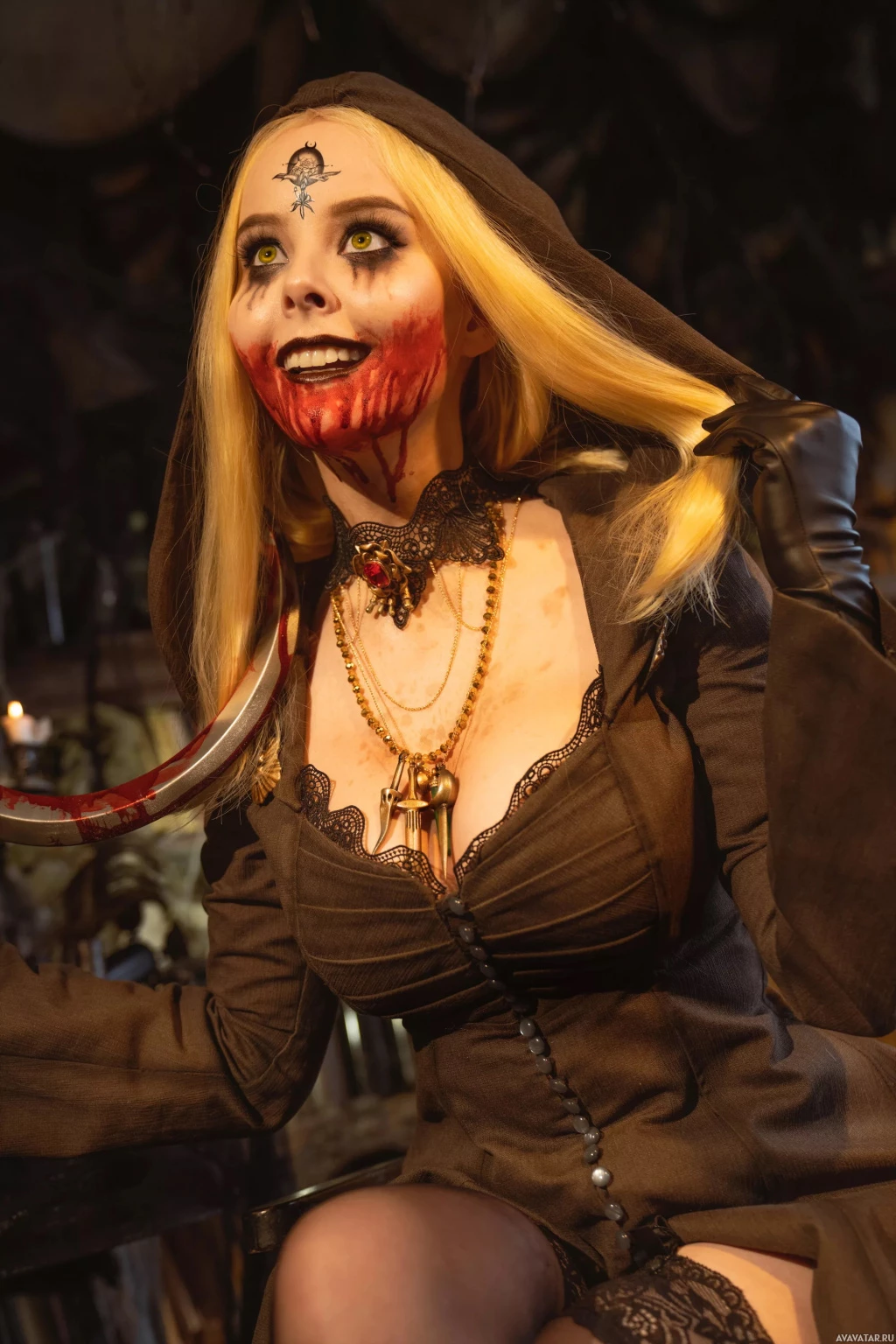 The image features a person dressed in costume, which is reminiscent of the character Dimitrescu's daughter from