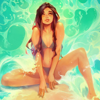 На картинке изображена стилизованная иллюстрация девушки, сидящей на скале, вокруг которой течет вода. У нее длинные темные волосы и она носит бикини. Ее выражение, по-видимому, является выражением созерцания или удовлетворенности.