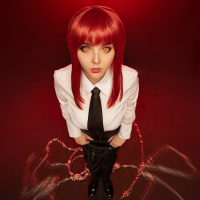 red hair styled in a way that might be typical for characters like Harley Quinn from the Batman series, given the overall look and makeup. They are wearing a dark suit with a tie, which could suggest a portrayal of a character from a comic book or video