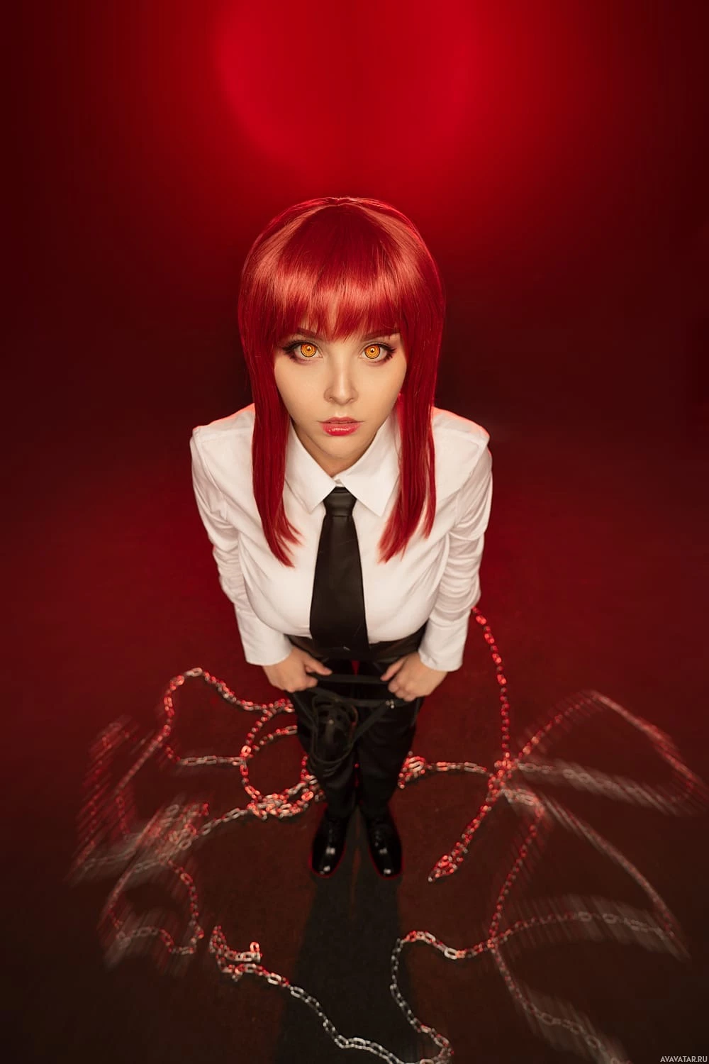 lighting effect, possibly intended to create a dramatic or intense atmosphere that complements the costume. There are also what appear to be chains on the floor behind the person, which might serve as part of the overall staging for this cosplay photoshoot.
