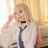 blonde hair with pink highlights, suggesting she might be cosplaying as a character from a popular anime or manga series. The character often associated with this style of clothing and hairstyle is