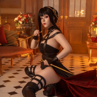 a confident expression on her face. The setting appears to be indoors, possibly a room designed with an antique or luxurious theme given