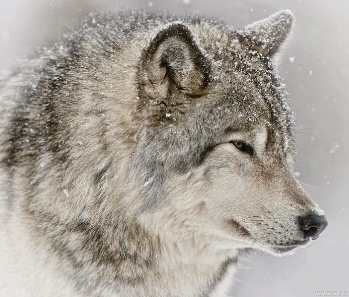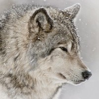 The image shows a wolf's head and upper torso, with the wolf looking off to one side. The wolf appears to have thick fur and a somewhat
