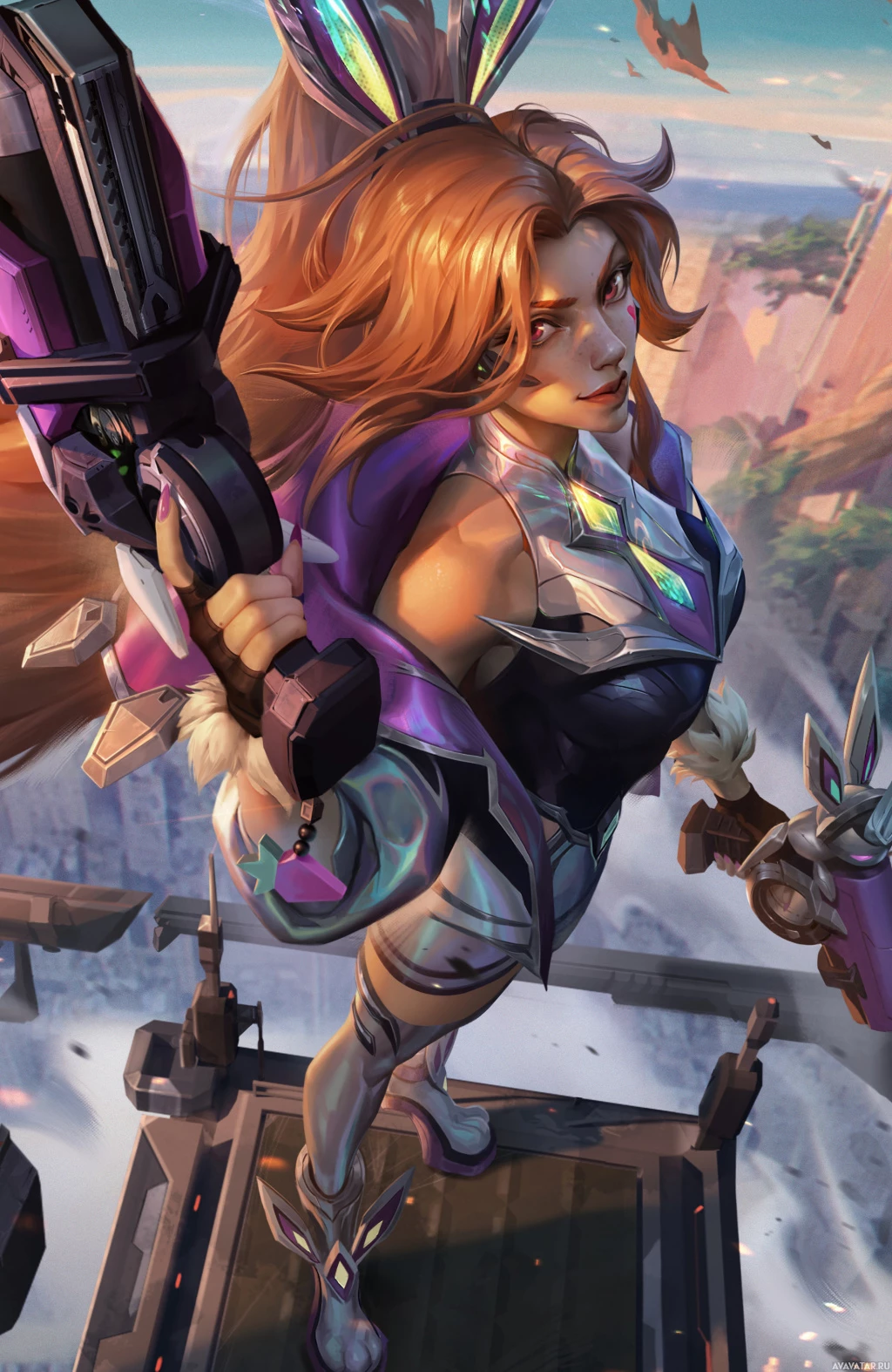 typical outfit, which includes purple and pink elements, along with a gun she is holding. Her expression appears to be focused or intense, fitting for a character known for being