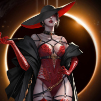 fantasy attire, including a large red hat, dark clothing, and what appear to be armored chest pieces. The background suggests an eerie or mysterious setting, possibly hinting at the themes found in the game itself.