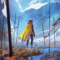the mystical atmosphere of the scene. The character appears to be looking out onto