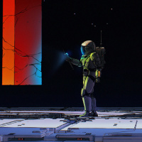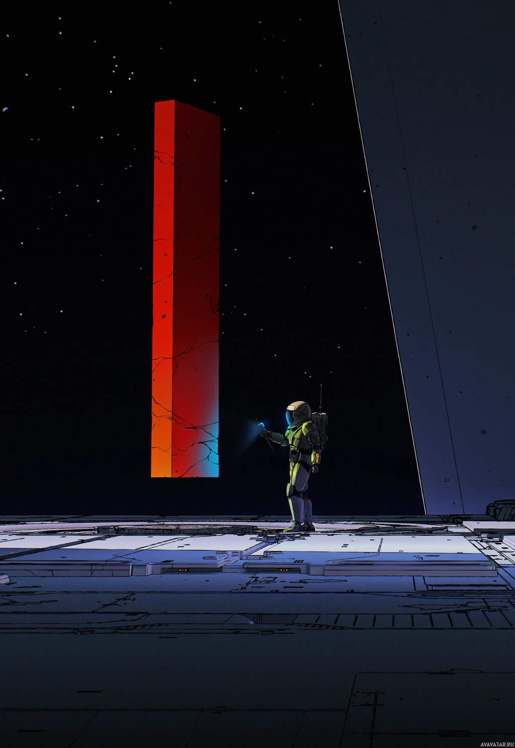 a lunar surface, looking out towards the horizon where there is a prominent red pillar or obelisk. The setting has a futuristic or science fiction theme, with