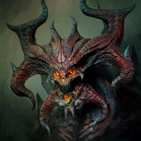a fantasy creature that resembles a demon from the Diablo series. It has a humanoid form with large, sharp horns, red skin, and