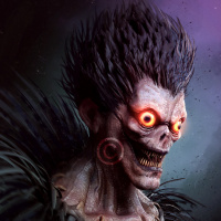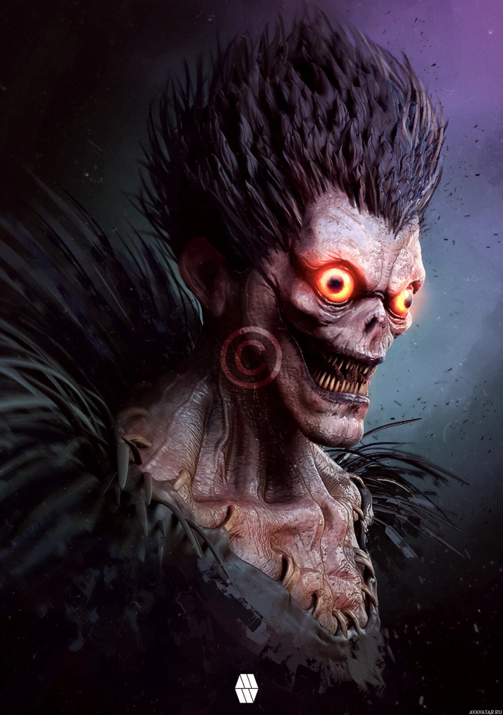 The image features an illustration of a character with a horror theme. This character has exaggerated facial features and is shown in profile, facing left. The eyes are glowing red, which adds to