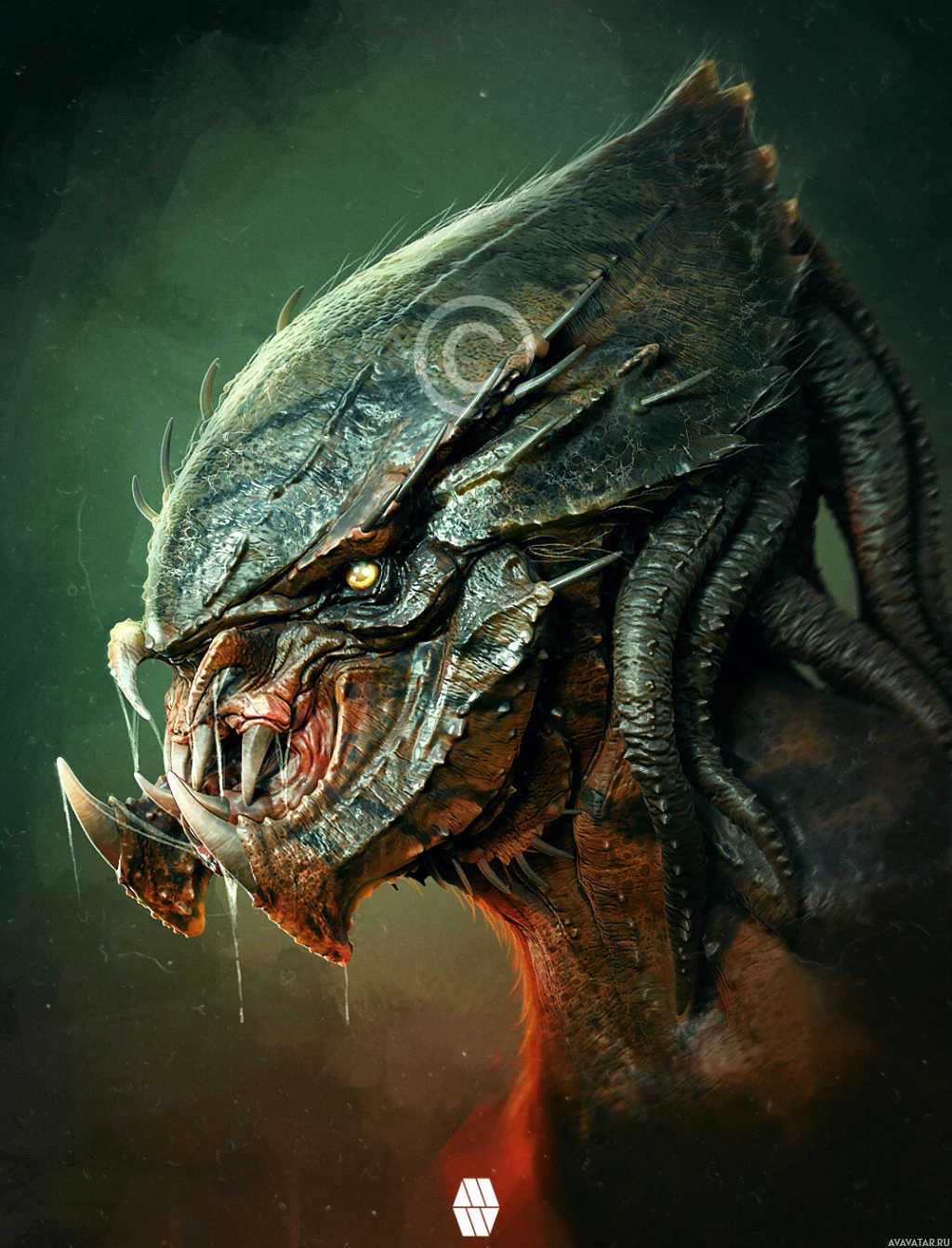 a fantastical creature that resembles a mix between a human and a monster. It has characteristics of both, with the head, torso, and arms of a human but with pronounced, spiked features on its head and shoulders that suggest a more menacing or alien appearance. The color palette is dark and moody, fitting the horror theme often associated with such imagery. This creature could be considered a representation of a "horror" monster due to its aggressive-looking expression and