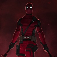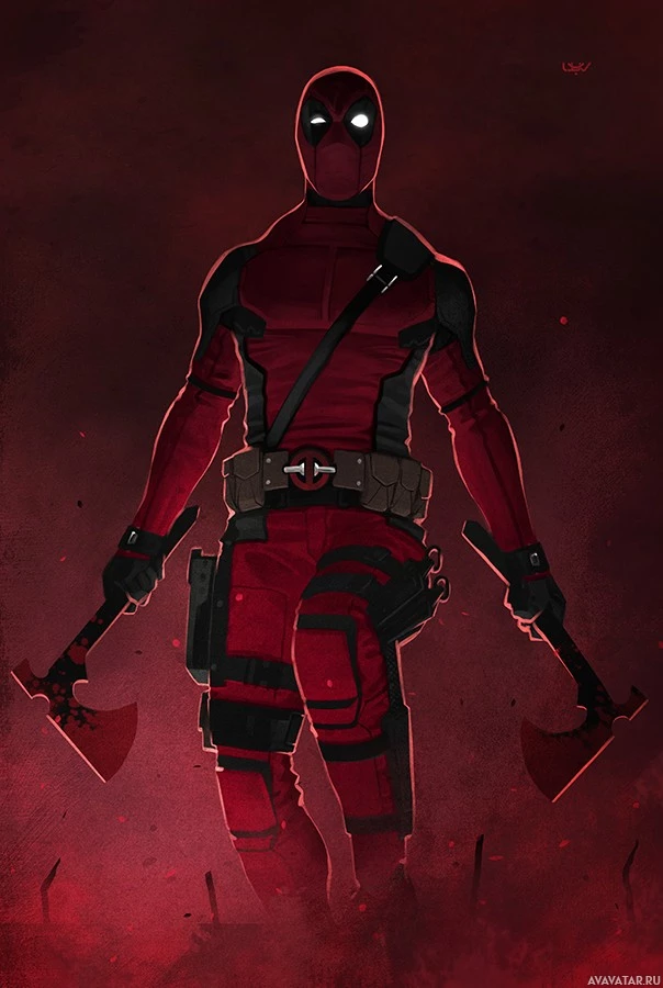 the Marvel Comics character Deadpool. He is depicted in his iconic red and black costume, complete with two guns attached to his shoulders and a sword in each hand. Deadpool is known for his