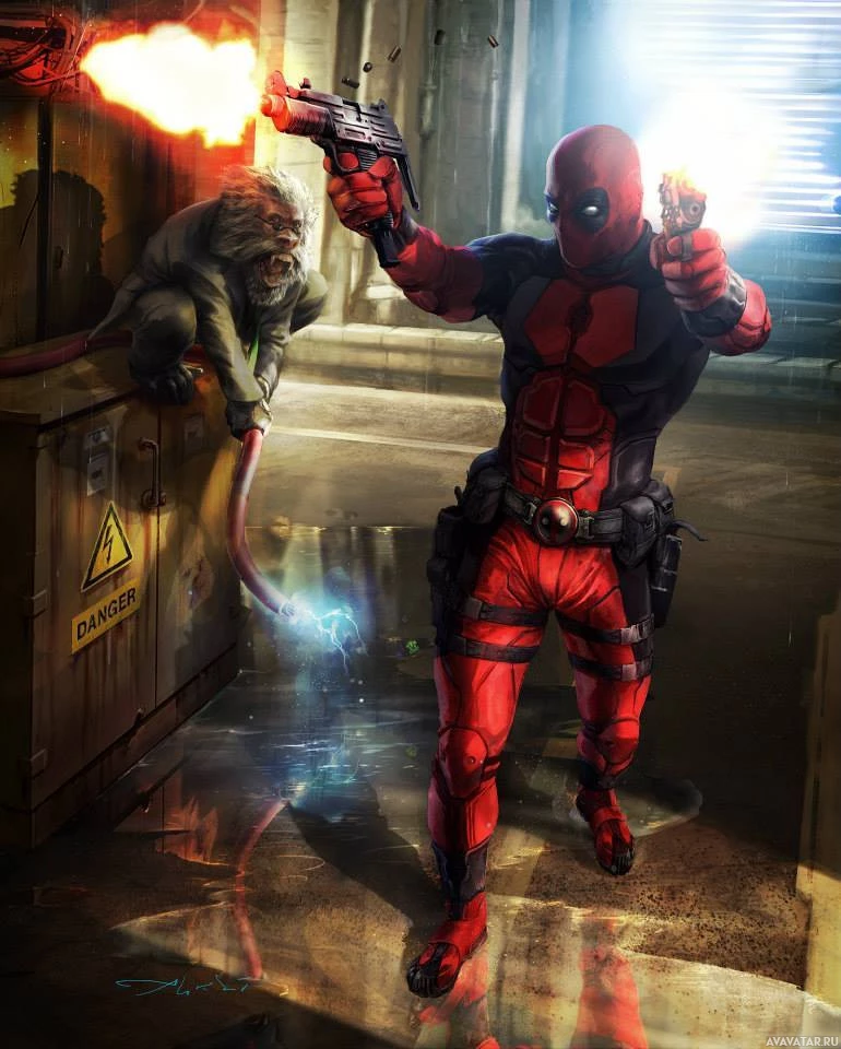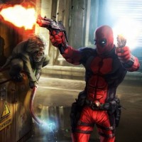 a character in the costume of Deadpool, known as Cable. He is holding two guns and aiming them down a corridor or alley, with a targeted look on his face. There's also another character crouching in the background, seemingly unaware of Cable's presence. The setting appears to be an industrial or urban environment, possibly a scene from a comic book or video game.