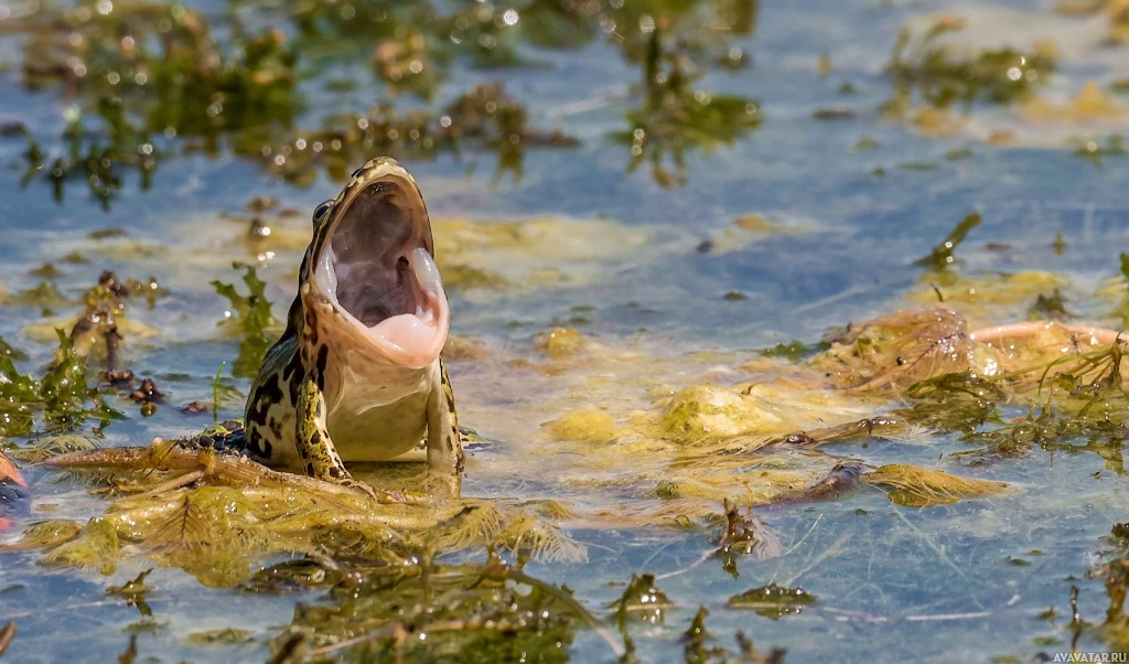 a small frog sitting on top of the water's surface. Both animals appear to be interacting with each other in their