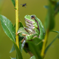 The image shows a lizard, which is an amphibian with legs adapted for walking or climbing. It's sitting on foliage and appears to be in a natural environment with greenery.