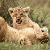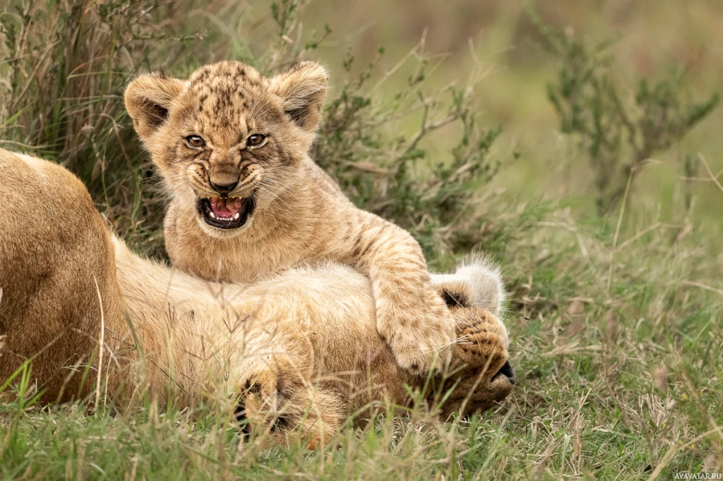 На картинке изображены два льва: взрослый и маленький львенок. Они лежат в естественной, поросшей травой среде, возможно, в дикой природе или в заповеднике. Львенок находится рядом со своей матерью и, кажется, плачет или издает какие-то звуки.