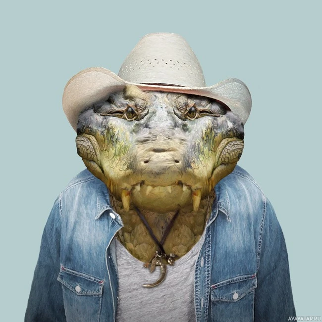 На картинке изображен человек, одетый в ковбойский наряд, одетый в шляпу и солнцезащитные очки. Голова крокодила накладывается на тело человека, придавая облик крокодило-человеческого гибрида с человеческим лицом и одеждой.