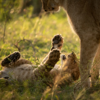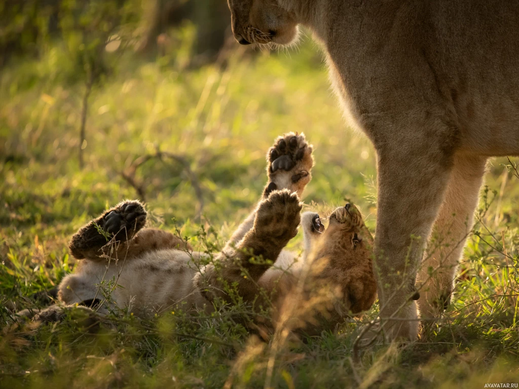 an adult lion interacting with a cub. The cub appears to be playing and rolling around on the grass, while the adult lion looks attentively at it. They are both situated in what seems to be