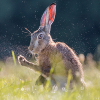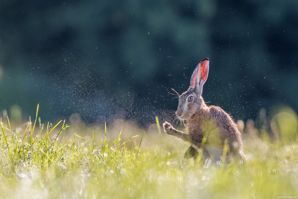 water droplets visible near the hare, possibly indicating recent rain or dew.