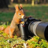 brown squirrel interacting with a camera. It appears to be sitting on the ground and has one paw gripping