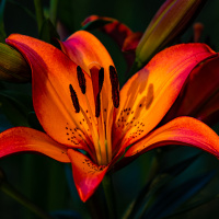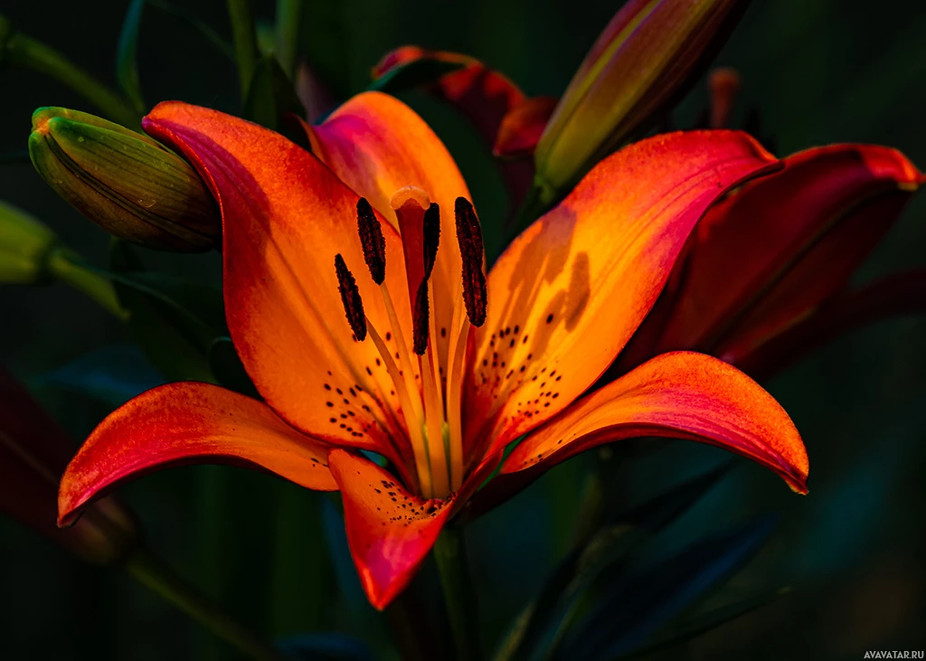 На картинке изображена одинокая красная лилия с полностью раскрытыми лепестками. Фон темный, что подчеркивает яркий цвет цветка. Вокруг цветка также видны зеленые листья и стебли.