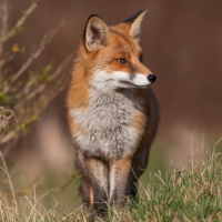 The image shows a fox standing on grass. It is looking off to one side, possibly observing its surroundings or watching for prey. The background is slightly blurred but appears to be