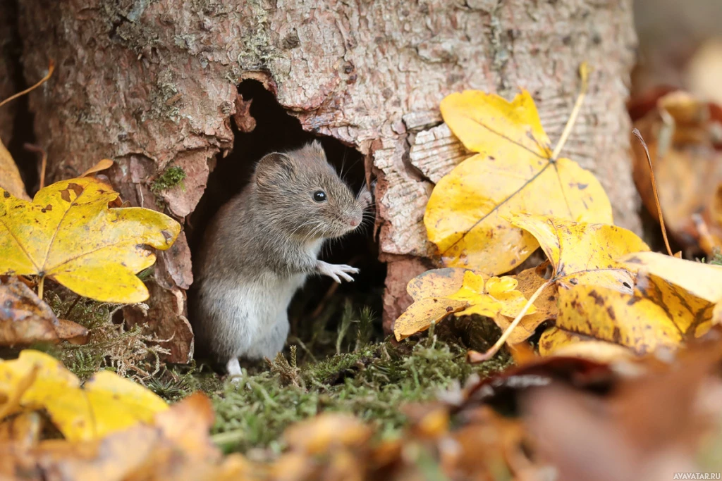 a small animal, which appears to be a mouse, emerging from what seems to be a hollow tree trunk or fallen log. There is a scattering of leaves around