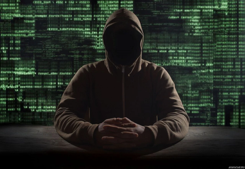 The image depicts a person sitting at a desk with their head covered by a hood. They are in front of a backdrop that resembles a digital or computer-generated environment, featuring numerous binary digits (0s and 1s) arranged to give the appearance of a complex