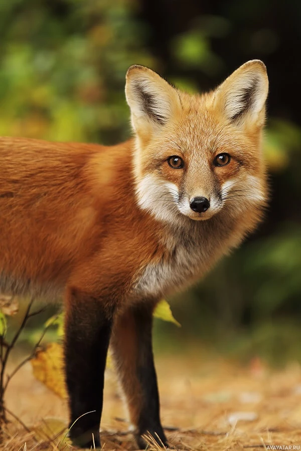 a red fox standing in what appears to be a natural forest setting. The fox is facing the camera and looking directly at it, suggesting curiosity or alertness. The background is filled with