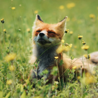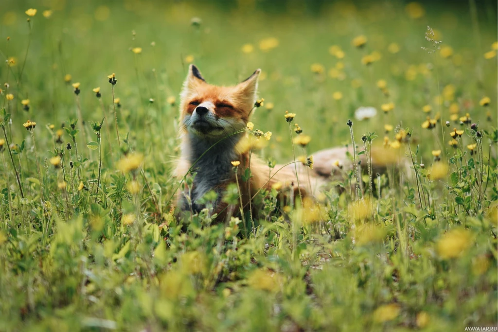 yellow flowers around the fox, indicating that this photo was likely taken in the spring or summer when flowers are blooming.